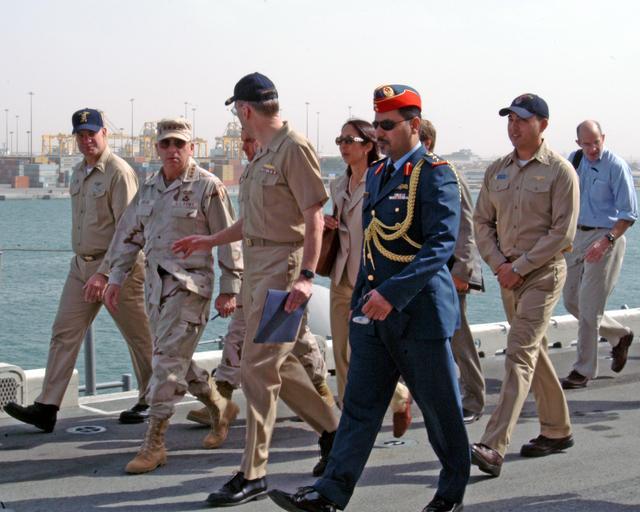 | Keywords: US Navy 041129-N-8801B-048 Commander, U.S. Central Command (CENTCOM), John P. Abizaid, U.S. Ambassador to United Arab Emirates (UAE) Michele J. Sison and UAE dignitaries.jpg en Dubai United Arab Emirates Nov 29 2004 Commander U S Central Command CENTCOM John P Abizaid U S Ambassador to United Arab Emirates UAE Michele J Sison and UAE dignitaries take a guided tour aboard the amphibious assault ship USS Essex LHD 2 hosted by Commanding Officer Capt Jan M Van tol The Essex Expeditionary Strike Group ESG is providing security and stability in the Northern Persian Gulf in support of Operation Iraqi Freedom OIF U S Navy Photo by Photographer s Mate Airman Travis M Burns RELEASED 2004-11-29 041129-N-8801B-048 Navy http //www navy mil/view_image asp id 19234 U S Navy Photo by Photographer s Mate Airman Travis M Burns PD-USGov-Military-Navy Images from US Navy location Dubai United Arab Emirates John Abizaid Aiguillette Michele J Sison |