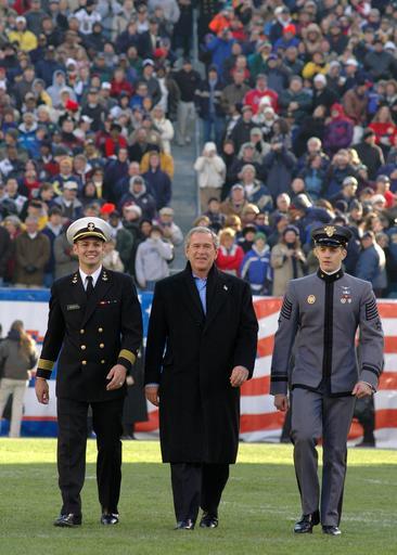 Keywords: US Navy 041204-N-2383B-207 President Bush escorted to mid-field at 105th Army Navy game.jpg en Philadelphia Pa Dec 4 2004 President George W Bush is escorted to mid-field by the Navy Brigade Commander Travis Amerine and the Army's 1st Captain Ryan Boeka during opening ceremonies at the 105th Army vs Navy Game The Navy Midshipmen defeated the Black Knights of Army 42-13 U S Navy photo by Chief Photographer s Mate Johnny Bivera RELEASED 2004-12-04 041204-N-2383B-207 Navy http //www navy mil/view_image asp id 19330 U S Navy photo by Chief Photographer s Mate Johnny Bivera PD-USGov-Military-Navy Military in Pennsylvania |
