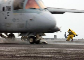 | Keywords: US Navy 041209-N-5345W-099 A catapult shooter braces himself from jet exhaust after giving the clear to launch signal to an S-3B Viking.jpg en Persian Gulf Dec 9 2004 - A catapult shooter braces himself from jet exhaust after giving the clear to launch signal to an S-3B Viking assigned to the Checkmates of Sea Control Squadron Two Two VS-22 aboard the Nimitz-class aircraft carrier USS Harry S Truman CVN 75 Currently aircraft from Carrier Air Wing Three CVW-3 embarked aboard Truman are providing close air support and conducting intelligence surveillance and reconnaissance missions in ongoing operations over Iraq Truman's Carrier Strike Group Ten CSG-10 and embarked CVW-3 are currently on a regularly scheduled deployment in support of the Global War on Terrorism U S Navy photo by Photographer's Mate Airman Kristopher Wilson RELEASED 2004-12-09 041209-N-5345W-099 Navy http //www navy mil/view_image asp id 19599 U S Navy photo by Photographer's Mate Airman Kristopher Wilson PD-USGov-Military-Navy Aboard USS Harry S Truman CVN-75 |