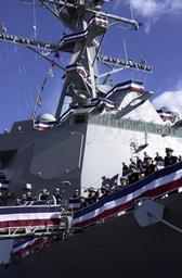 Keywords: US Navy 041211-N-3768B-002 Sailors enact the longstanding Naval tradition of manning the rails after bringing the ship to life aboard the newly commissioned guided missile destroyer USS James E. Williams (DDG 95).jpg en Charleston S C Dec 11 2004 Sailors enact the longstanding Naval tradition of manning the rails after bringing the ship to life aboard the newly commissioned guided missile destroyer USS James E Williams DDG 95 at the Naval Weapons Station in Charleston S C The ship honors Boatswain s Mate 1st Class James E Williams one of the Navy's most highly decorated enlisted Sailors having been awarded the Congressional Medal of Honor for bravery and leadership in 1966 while serving as patrol boat captain and patrol commander of River Patrol Boat PBR 105 on the Mekong River Republic of Vietnam James E Williams will be commissioned Saturday Dec 11th as the 45th Arleigh Burke-class guided missile destroyer authorized by Congress U S Navy photo by Journalist 2nd Class Jim Brown RELEASED 2004-12-11 041211-N-3768B-002 Navy http //www navy mil/view_image asp id 19559 U S Navy photo by Journalist 2nd Class Jim Brown PD-USGov-Military-Navy Images from US Navy location Charleston S C USS James E Williams DDG-95 Manning the rail in the United States Navy |