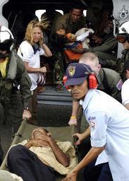 | Keywords: US Navy 050103-N-4166B-179 Sailors, assigned to Carrier Air Wing Two (CVW-2) and aid workers unload injured Indonesians from the cabin of an MH-60S Knighthawk helicopter.jpg en Aceh Sumatra Indonesia Jan 3 2005 - Sailors assigned to Carrier Air Wing Two CVW-2 and aid workers unload injured Indonesians from the cabin of an MH-60S Knighthawk helicopter assigned to the Gunbearers of Helicopter Combat Support Squadron Eleven HC-11 Detachment Two to a triage site for treatment and evaluation Medical teams from USS Abraham Lincoln CVN 72 Carrier Air Wing Two CVW-2 and the International Organization for Migration IOM set-up a triage site located on Sultan Iskandar Muda Air Force Base in Banda Aceh Sumatra The two teams worked together with members of the Australian Air Force to provide initial medical care to victims of the Tsunami-stricken coastal regions The Abraham Lincoln Carrier Strike Group is currently operating in the Indian Ocean off the waters of Indonesia and Thailand U S Navy photo by Photographer's Mate Airman Jordon R Beesley RELEASED 2005-01-03 050103-N-4166B-179 Navy http //www navy mil/view_image asp id 20097 U S Navy photo by Photographer's Mate Airman Jordon R Beesley PD-USGov-Military-Navy Aceh Humanitarian aid in Indonesia Helicopter Combat Support Squadron 11 United States Navy |