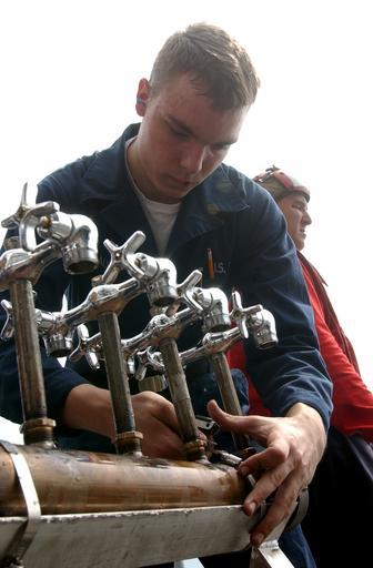 Keywords: US Navy 050105-N-4383M-028 Hull Maintenance Technician Fireman Dennis J. Walsh of Grants Pass, Ore., prepares to test a fresh water distribution manifold on the flight deck aboard the amphibious assault ship USS Bonhomme Richa.jpg en Andaman Sea Jan 5 2005 - Hull Maintenance Technician Fireman Dennis J Walsh of Grants Pass Ore prepares to test a fresh water distribution manifold on the flight deck aboard the amphibious assault ship USS Bonhomme Richard LHD 6 The ship's Repair Division is manufacturing more than 20 fresh water manifolds for humanitarian relief efforts in South East Asia The Bonhomme Richard Expeditionary Strike Group is currently operating off the coast of the Indonesian island of Sumatra in support of Operation Unified Assistance U S Navy photo by Photographer's Mate 1st Class Renee F Martinez RELEASED 2005-01-05 050105-N-4383M-028 Navy http //www navy mil/view_image asp id 20238 U S Navy photo by Photographer's Mate 1st Class Renee F Martinez PD-USGov-Military-Navy Aboard USS Bonhomme Richard LHD-6 Hull Maintenance Technician United States Navy Manifolds |