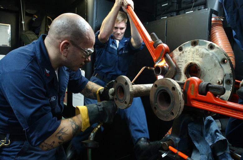 | Keywords: US Navy 050114-N-8148A-646 Hull Maintenance Technician 1st Class Chip Land, of Boulder, Colo., left, heats-up a nut on a steam coil with a blow torch while Hull Maintenance Technician 3rd Class Jason Roosien, of Grand Rapids, M.jpg en Pacific Ocean Jan 14 2005 - Hull Maintenance Technician 1st Class Chip Land of Boulder Colo left heats-up a nut on a steam coil with a blow torch while Hull Maintenance Technician 3rd Class Jason Roosien of Grand Rapids Mich attempts to break free the nut with a 24 pipe wrench aboard USS Ronald Reagan CVN 76 The Nimitz-class aircraft carrier Ronald Reagan is underway in the Pacific Ocean conducting routine carrier operations U S Navy photo by Photographer's Mate 3rd Class Kitt Amaritnant RELEASED 2005-01-14 050114-N-8148A-646 Navy http //www navy mil/view_image asp id 20821 U S Navy photo by Photographer's Mate 3rd Class Kitt Amaritnant PD-USGov-Military-Navy Maintenance on USS Ronald Reagan CVN-76 Hull Maintenance Technician United States Navy Pipe wrenches |
