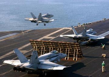 Keywords: US Navy 050115-N-2984R-062 An F-A-18A- Hornet takes off aboard USS Harry S. Truman (CVN 75).jpg en Persian Gulf Jan 15 2005 - An F/A-18A+ Hornet assigned to the Silver Eagles of Marine Fighter Attack Squadron One One Five VMFA-115 takes off aboard USS Harry S Truman CVN 75 Carrier Air Wing Three CVW-3 is embarked aboard USS Harry S Truman and is providing close air support and conducting intelligence surveillance and reconnaissance missions over Iraq The Truman Strike Group and CVW-3 are on a regularly scheduled deployment in support of the Global War on Terrorism U S Navy photo by Photographer's Mate Airman Apprentice Ricardo J Reyes RELEASED 2005-01-15 050115-N-2984R-062 Navy http //www navy mil/view_image asp id 20755 U S Navy photo by Photographer's Mate Airman Apprentice Ricardo J Reyes PD-USGov-Military-Navy F/A-18A Hornet in flight Aboard USS Harry S Truman CVN-75 F/A-18 Hornet aircraft carrier launches Blast deflectors aircraft carrier |