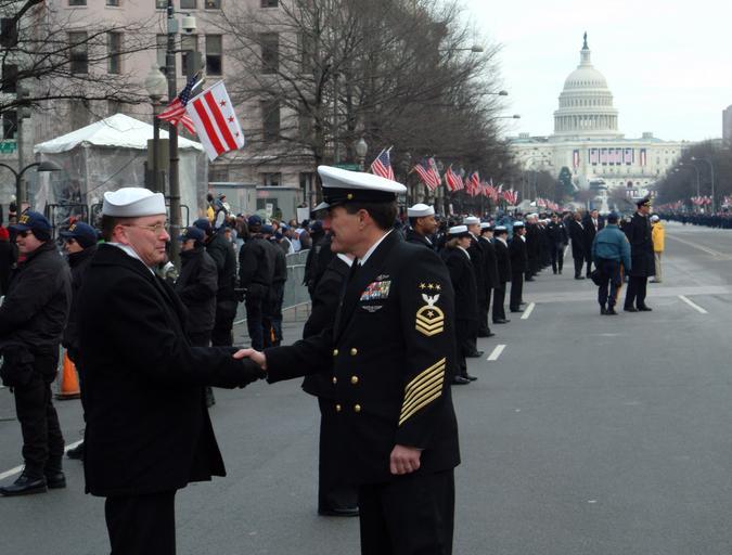 Keywords: US Navy 050120-N-0962S-044 Master Chief Petty Officer of the Navy (MCPON) Terry Scott shakes hands with one of the hundreds of Sailors who helped line the street cordon down Pennsylvania Avenue for the Inauguration Day Parade.jpg en Washington D C Jan 20 2005 - Master Chief Petty Officer of the Navy MCPON Terry Scott shakes hands with one of the hundreds of Sailors who helped line the street cordon down Pennsylvania Avenue for the Inauguration Day Parade held in Washington D C More than 5 000 men and women in uniform took part in the 55th Presidential Inauguration U S Navy photo by Journalist 2nd Class Brandan W Schulze RELEASED 2005-01-20 050120-N-0962S-044 Navy http //www navy mil/view_image asp id 21041 U S Navy photo by Journalist 2nd Class Brandan W Schulze PD-USGov-Military-Navy People of the United States Navy George W Bush 2005 presidential inauguration Terry D Scott Handshakes involving the military |