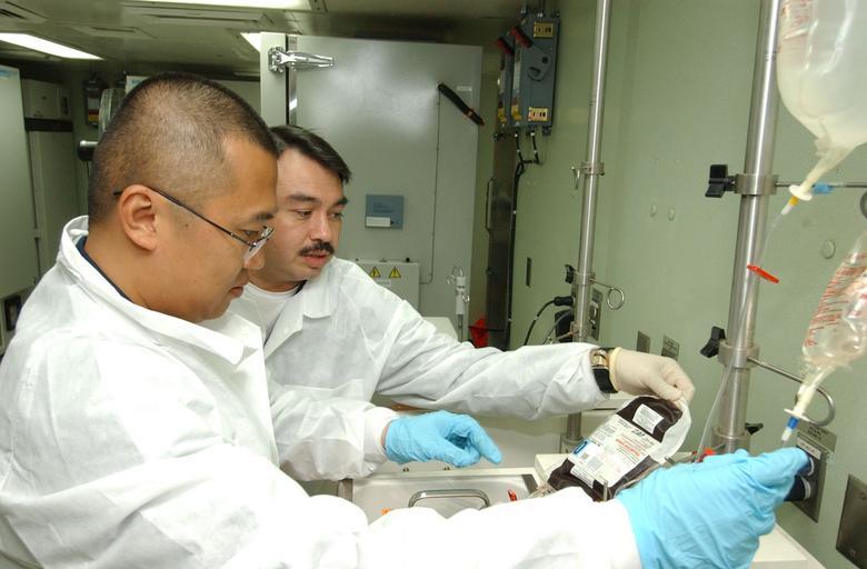 | Keywords: US Navy 050217-N-6665R-022 Corpsmen deglycing frozen packs of red blood cells.jpg en Indian Ocean Feb 17 2005 Hospital Corpsman 2nd Class Renulfo Moralesa a lab technician aboard the Military Sealift Command MSC hospital ship USNS Mercy T-AH 19 cross-trains Hospital Corpsman 1st Class Christopher Mapanao on deglycing frozen packs of red blood cells for use aboard the ship Once the blood cell is deglyced it must be used in 24 hours Mercy is serving as an enabling platform to assist humanitarian operations ashore in ways that host nations and international relief organization find useful Mercy is currently off the waters of Indonesia in support of Operation Unified Assistance the humanitarian relief effort to aid the victims of the tsunami that struck Southeast Asia U S Navy photo by Photographer's Mate 2nd Class Jeffery Russell RELEASED 2005-02-17 050217-N-6665R-022 Navy http //www navy mil/view_image asp id 22021 U S Navy photo by Photographer's Mate 2nd Class Jeffery Russell PD-USGov-Military-Navy Aboard USNS Mercy T-AH-19 Hospital Corpsman |
