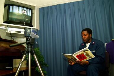 Keywords: US Navy 050222-N-6504N-001 Personnelman 2nd Class Kennedy James reads in front of a video camera as part of the Uniting Through Reading program aboard the Military Sealift Command (MSC) hospital ship USNS Mercy (T-AH 19).jpg en Indian Ocean Feb 15 2005 - Personnelman 2nd Class Kennedy James reads in front of a video camera as part of the Uniting Through Reading program aboard the Military Sealift Command MSC hospital ship USNS Mercy T-AH 19 The Uniting Through Reading Program gives deployed parents the opportunity to read to their kids back home Mercy is serving as an enabling platform to assist humanitarian operations ashore in ways that host nations and international relief organization find useful Mercy is currently off the waters of Indonesia in support of Operation Unified Assistance the humanitarian relief effort to aid the victims of the tsunami that struck Southeast Asia U S Navy photo by Journalist 3rd Class Issac Needleman RELEASED 2005-02-15 050222-N-6504N-001 Navy http //www navy mil/view_image asp id 22217 U S Navy photo by Journalist 3rd Class Issac Needleman PD-USGov-Military-Navy Aboard USNS Mercy T-AH-19 Personnelman |