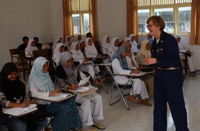 Keywords: US Navy 050223-N-8796S-085 Cmdr. Suzanne Clark, a U.S. Navy Nurse assigned to the Military Sealift Command (MSC) hospital ship USNS Mercy (T-AH 19), takes questions after giving a lecture on diabetes to Indonesian nursing stude.jpg en Banda Aceh Sumatra Indonesia Feb 23 2005 - Cmdr Suzanne Clark a U S Navy Nurse assigned to the Military Sealift Command MSC hospital ship USNS Mercy T-AH 19 takes questions after giving a lecture on diabetes to Indonesian nursing students at the University Hospital in Banda Aceh on the island of Sumatra Indonesia Mercy is serving as an enabling platform to assist humanitarian operations ashore in ways that host nations and international relief organization find useful Mercy is currently off the waters of Indonesia in support of Operation Unified Assistance the humanitarian relief effort to aid the victims of the tsunami that struck Southeast Asia U S Navy photo by Photographer's Mate 2nd Class Timothy Smith RELEASED 2005-02-23 050223-N-8796S-085 Navy http //www navy mil/view_image asp id 22178 U S Navy photo by Photographer's Mate 2nd Class Timothy Smith PD-USGov-Military-Navy Banda Aceh |