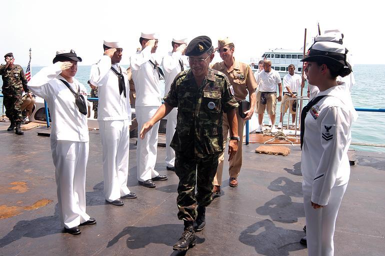 | Keywords: US Navy 050226-N-9860Y-001 Royal Thai Army Chief of Staff, Gen. Lertrat Rattavanich, walks through ceremonial sideboys for a scheduled tour of the command ship USS Blue Ridge (LCC 19).jpg en Phuket Thailand Feb 26 2005 Royal Thai Army Chief of Staff Gen Lertrat Rattavanich walks through ceremonial sideboys for a scheduled tour of the command ship USS Blue Ridge LCC 19 Blue Ridge is in Phuket to support Operation Unified Assistance the humanitarian relief effort to aid the victims of the tsunami that struck Southeast Asia The Sailors and Marines aboard Blue Ridge will participate in tsunami related community relations projects and conduct training with foreign military personnel U S Navy photo by Photographer's Mate 3rd Class Tucker M Yates RELEASED 2005-02-26 050226-N-9860Y-001 Navy http //www navy mil/view_image asp id 22383 U S Navy photo by Photographer's Mate 3rd Class Tucker M Yates PD-USGov-Military-Navy Images from US Navy location Phuket Thailand |