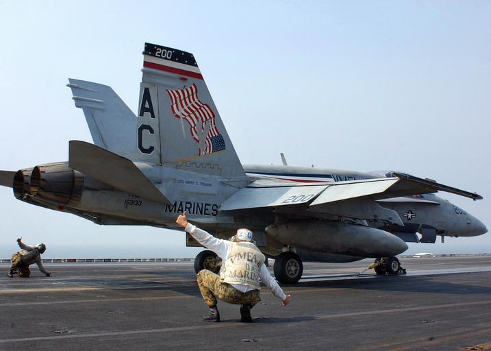 | Keywords: US Navy 050227-N-0535P-033 Two Marine final checkers give the thumbs up for an F-A-18A- Hornet to launch.jpg en Persian Gulf Feb 27 2005 - Two Marine final checkers assigned to the Silver Eagles of Marine Fighter Attack Squadron One One Five VMFA-115 give the thumbs up for an F/A-18A+ Hornet to launch from the flight deck aboard USS Harry S Truman CVN 75 Carrier Air Wing Three CVW-3 is embarked aboard Truman and is providing close air support and conducting intelligence surveillance and reconnaissance over Iraq The Truman Carrier Strike Group is on a regularly scheduled deployment in support of the Global War on Terrorism U S Navy photo by Photographer's Mate Airman Jay C Pugh RELEASED 2005-02-27 050227-N-0535P-033 Navy http //www navy mil/view_image asp id 22450 U S Navy photo by Photographer's Mate Airman Jay C Pugh PD-USGov-Military-Navy Aboard USS Harry S Truman CVN-75 Military people with thumbs up |