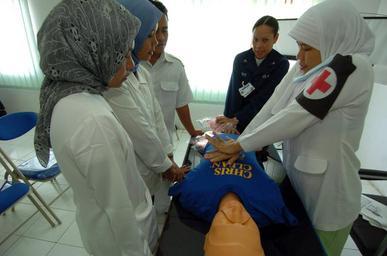 Keywords: US Navy 050301-N-8629M-332 An Indonesian nurse practices cardio pulmonary resuscitation (CPR) under the instruction of Hospital Corpsman 3rd Class Lynette Shute.jpg en Banda Aceh Sumatra Indonesia Mar 1 2005 - An Indonesian nurse practices cardio pulmonary resuscitation CPR under the instruction of Hospital Corpsman 3rd Class Lynette Shute during a CPR class taught by military members assigned to the Military Sealift Command MSC hospital ship USNS Mercy T-AH 19 at Tentera Nasional Indonesia Military Hospital in Banda Aceh Indonesia Mercy is serving as an enabling platform to assist humanitarian operations ashore in ways that host nations and international relief organization find useful Mercy is currently off the waters of Indonesia in support of Operation Unified Assistance the humanitarian relief effort to aid the victims of the tsunami that struck Southeast Asia U S Navy photo by Photographer's Mate 3rd Class Rebecca J Moat RELEASED 2005-03-01 050301-N-8629M-332 Navy http //www navy mil/view_image asp id 22365 U S Navy photo by Photographer's Mate 3rd Class Rebecca J Moat PD-USGov-Military-Navy Banda Aceh Hospital Corpsman |