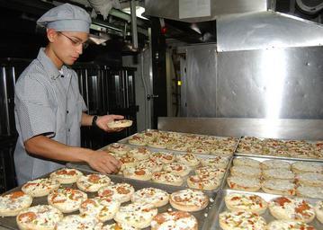 Keywords: US Navy 050313-N-2198V-011 Culinary Specialist 3rd Class Robert Diaz from the Republic of Puerto Rico prepares pizza for the crew.jpg en Pacific Ocean Mar 13 2005 Culinary Specialist 3rd Class Robert Diaz from the Republic of Puerto Rico prepares pizza for the crew Every Saturday night the crew has Pizza Night while underway Carl Vinson Strike Group is currently on deployment in the Western Pacific USS Carl Vinson will end its deployment with a homeport shift to Norfolk Va in support of a three-year refuel and complex overhaul U S Navy photo by Photographer s Mate Airman Crystal M Vigil RELEASED 2005-03-13 050313-N-2198V-011 Navy http //www navy mil/view_image asp id 22713 U S Navy photo by Photographer s Mate Airman Crystal M Vigil PD-USGov-Military-Navy Culinary specialist United States Navy Aboard USS Carl Vinson CVN-70 Pizza baking Galleys on United States Navy ships |
