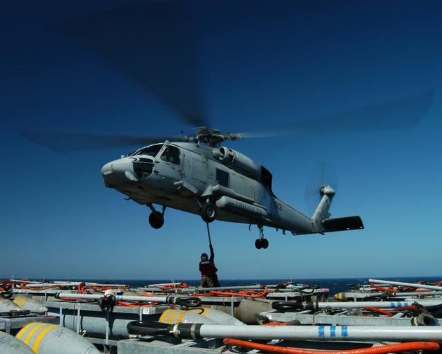 | Keywords: US Navy 050313-N-4565G-002 Aviation Ordnancemen hook a cargo pendant to an SH-60B Seahawk.jpg en Atlantic Ocean Mar 13 2005 - Aviation Ordnancemen hook a cargo pendant to an SH-60B Seahawk assigned to the Emerald Knights of Helicopter Antisubmarine Squadron Seven Five HS-75 during a ammunition and ordnance off-load between USS John F Kennedy CV 67 and the Military Sealift Command MSC fast combat support ship USNS Supply T-AOE 6 U S Navy photo by Photographer s Mate 3rd Class Tommy Gilligan RELEASED 2005-03-13 050313-N-4565G-002 Navy http //www navy mil/view_image asp id 22714 U S Navy photo by Photographer s Mate 3rd Class Tommy Gilligan PD-USGov-Military-Navy Aboard USS John F Kennedy CV-67 Aviation Ordnanceman Aboard USNS Supply T-AOE-6 |