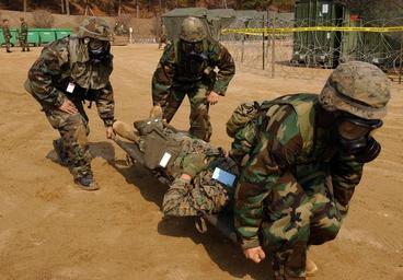 | Keywords: US Navy 050322-N-7027P-119 U.S. Marines assigned to the 3rd Marine Expeditionary Force, perform a casualty decontamination drill at Third Republic of Korea Army Base during Reception, Staging, Onward movement, and Integration-F.jpg en Yogin Republic of Korea Mar 22 2005 U S Marines assigned to the 3rd Marine Expeditionary Force perform a casualty decontamination drill at Third Republic of Korea Army Base during Reception Staging Onward movement and Integration/Foal Eagle exercises RSO I/Foal Eagle RSO I is a complex multi-phase exercise conducted annually tailored to train test and demonstrate United States and Republic of Korea force projection and deployment capabilities Foal Eagle exercise runs simultaneously and trains in all aspects of Combined Forces Command's mission U S Navy photo by Photographer's Mate 2nd Class Sandra M Palumbo RELEASED 2005-03-22 050322-N-7027P-119 Navy http //www navy mil/view_image asp id 22939 U S Navy photo by Photographer's Mate 2nd Class Sandra M Palumbo PD-USGov-Military-Navy Images from US Navy location Yogin Republic of Korea Foal Eagle 2005 M40 Field Protective Mask Casualty movement III Marine Expeditionary Force |