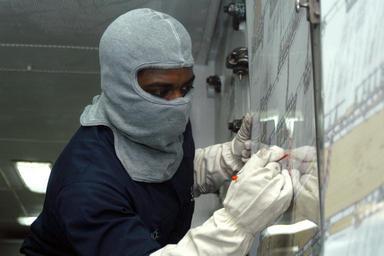 Keywords: US Navy 050329-N-9805F-005 Machinery Repairman 2nd class Dunte Rice of Cleveland, Ohio, the plotter in Damage Control Central (DCC), maps out damage throughout the ship.jpg en Atlantic Ocean Mar 29 2005 - Machinery Repairman 2nd class Dunte Rice of Cleveland Ohio the plotter in Damage Control Central DCC maps out damage throughout the ship during a general quarters drill aboard USS Theodore Roosevelt CVN 71 The nuclear powered aircraft carrier is currently underway for Tailored Ship Training Availability and Final Evaluation Problem TSTA/FEP in the Atlantic Ocean U S Navy photo by Photographer's Mate Airman Tony Foster RELEASED 2005-03-29 050329-N-9805F-005 Navy http //www navy mil/view_image asp id 23181 U S Navy photo by Photographer's Mate Airman Tony Foster PD-USGov-Military-Navy Aboard USS Theodore Roosevelt CVN-71 Damage Control Central Anti-flash gear |