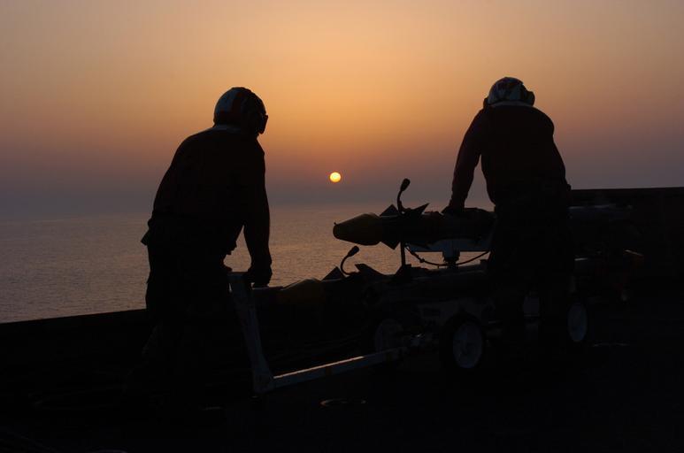 | Keywords: US Navy 050424-N-9446C-067 Aviation ordnancemen move Carrier Air Training Missiles (CATMs) from the.jpg en Persian Gulf April 24 2005 - Aviation ordnancemen move Carrier Air Training Missiles CATMs from the Bomb Farm into position for attachment to aircraft prior to flight operations aboard the Nimitz-class aircraft carrier USS Carl Vinson CVN 70 The Carl Vinson Carrier Strike Group is conducting operations in support of multi-national forces in Iraq and maritime security operations in the Persian Gulf Carl Vinson will end its deployment with a homeport shift to Norfolk Va and will conduct a three-year refuel and complex overhaul U S Navy photo by Photographer's Mate Airman Refugio Carrillo RELEASED 2005-04-24 050424-N-9446C-067 Navy http //www navy mil/view_image asp id 23894 U S Navy photo by Photographer's Mate Airman Refugio Carrillo PD-USGov-Military-Navy Aboard USS Carl Vinson CVN-70 Aviation Ordnanceman Silhouettes of men Brown sunsets People with sunsets |