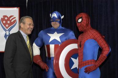 Keywords: US Navy 050428-N-0295M-001 Secretary of Defense Donald Rumsfeld meets superheroes Captain America and Spider-Man during the unveiling of a comic book that will be distributed free to U.S. forces in Iraq and around the world.jpg en Pentagon Washington D C April 28 2005 - Secretary of Defense Donald Rumsfeld meets superheroes Captain America and Spider-Man during the unveiling of a comic book that will be distributed free to U S forces in Iraq and around the world Featuring the Avengers Fantastic Four Spider-Man and other Marvel heroes the comic book will have a print run of one million copies and be distributed through the military exchanges The first 150 000 copies will be distributed to personnel in the Middle East The comic book is part of America Supports You a Department of Defense campaign that encourages private citizens communities and businesses to reach out to military personnel and their families U S Navy photo by Photographer's Mate 2nd Class Daniel J McLain RELEASED 2005-04-28 050428-N-0295M-001 Navy http //www navy mil/view_image asp id 24005 U S Navy photo by Photographer's Mate 2nd Class Daniel J McLain PD-USGov-Military-Navy Cosplay of Spider-Man and his cast Cosplay of Captain America and his cast Donald Rumsfeld in 2005 America Supports You