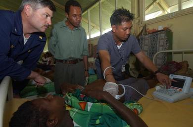 Keywords: US Navy 050516-N-7027P-089 Hospital Corpsman 2nd Class Anthony Ecija performs an ultra sound on a patient at the Modilon General Hospital.jpg en Madang Papua New Guinea May 16 2005 - Hospital Corpsman 2nd Class Anthony Ecija performs an ultra sound on a patient at the Modilon General Hospital in Madang Papua New Guinea as Capt Tim Bemiller and a local doctor review the next step needed in the medical care of the patient Mercy and the MSC combat stores ship USNS Niagara Falls T-AFS 3 are on station off the coast of Papua New Guinea to provide humanitarian assistance and focused medical care to the residents of the area Mercy is en route to its homeport of San Diego after taking part in Operation Unified Assistance in support of tsunami and earthquake relief operations in Indonesia U S Navy photo by Photographer's Mate 2nd Class Sandra M Palumbo RELEASED 2005-05-16 050516-N-7027P-089 Navy http //www navy mil/view_image asp id 24350 U S Navy photo by Photographer's Mate 2nd Class Sandra M Palumbo PD-USGov-Military-Navy Madang Hospital Corpsman Aboard USS Niagara Falls AFS-3 |