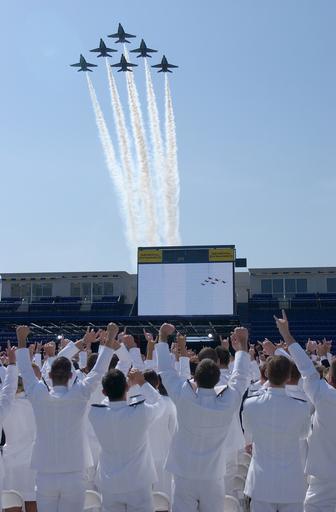 Keywords: US Navy 050527-F-7379W-097 The U.S. Navy flight demonstration team, the Blue Angels, perform a fly-over during the opening ceremonies for the 2005 Graduation and Commissioning Ceremony at the U.S. Naval Academy.jpg en Annapolis Md May 27 2005 - The U S Navy flight demonstration team the Blue Angels perform a fly-over during the opening ceremonies for the 2005 Graduation and Commissioning Ceremony at the U S Naval Academy Nine hundred seventy-six Midshipmen graduated from the U S Naval Academy and became commissioned officers in the U S Military President George W Bush delivered the commencement address and personally greeted each graduate during the ceremony The men and women of the graduating class were sworn into the Navy as Ensigns or into the Marine Corps as Second Lieutenants U S Air Force photo by Staff Sgt Charles Walker RELEASED 2005-05-27 050527-F-7379W-097 Navy http //www navy mil/view_image asp id 24807 U S Navy photo PD-USGov-Military-Navy Flyovers in the United States Graduation and Commissioning Ceremony May 27 2005 Blue Angels F/A-18 Hornet in 2005