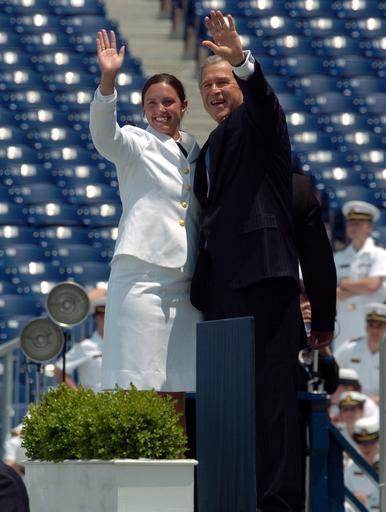 | Keywords: US Navy 050527-N-9693M-025 President of the United State, George W. Bush waves to the parents of Midshipman Shannon Lynne Bailey, left, moments prior to receiving her degree in Oceanography from the U.S. Naval Academy.jpg en Annapolis Md May 27 2005 - President of the United State George W Bush waves to the parents of Midshipman Shannon Lynne Bailey left moments prior to receiving her degree in Oceanography from the U S Naval Academy Later Bailey and Nine hundred seventy-five fellow Midshipmen became commissioned officers in the U S Military President George W Bush delivered the commencement address and personally greeted each graduate during the ceremony The men and women of the graduating class were sworn into the Navy as Ensigns or into the Marine Corps as Second Lieutenants U S Navy photo by Damon J Moritz RELEASED 2005-05-27 050527-N-9693M-025 Navy http //www navy mil/view_image asp id 24778 U S Navy photo by Damon J Moritz PD-USGov-Military-Navy Graduation and Commissioning Ceremony May 27 2005 |