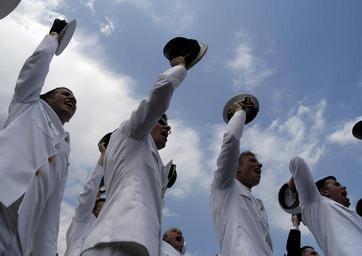 | Keywords: US Navy 050527-N-0295M-008 Newly commissioned Ensigns remove their covers prior to tossing them in the air as part of the U.S. Naval Academy class of 2005 graduation and commissioning ceremony.jpg en Annapolis Md May 27 2005 Newly commissioned Ensigns remove their covers prior to tossing them in the air as part of the U S Naval Academy class of 2005 graduation and commissioning ceremony The hat toss now a traditional ending to the ceremony originated at the Naval Academy in 1912 This hat toss has since become a symbolic and visual end to the four-year program Nine hundred-seventy six Midshipmen graduated from the U S Naval Academy and became commissioned officers in the U S Military President George W Bush delivered the commencement address and personally greeted each graduate during the ceremony The men and women of the graduating class were sworn into the Navy as Ensigns or into the Marine Corps as Second Lieutenants U S Navy photo by Photographer s Mate 2nd Class Daniel J McLain RELEASED 2005-05-27 050527-N-0295M-008 Navy http //www navy mil/view_image asp id 24784 U S Navy photo by Photographer s Mate 2nd Class Daniel J McLain PD-USGov-Military-Navy Hat tossing Graduation and Commissioning Ceremony May 27 2005 |