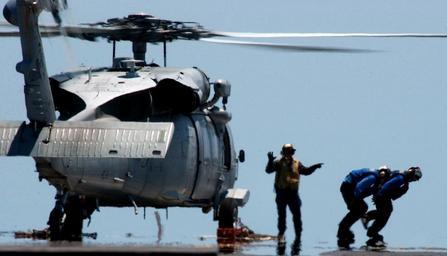 Keywords: US Navy 050529-N-7130B-073 An aircraft director signals two flight deck crews members away the spinning rotors of an MH-60S Knighthawk.jpg en Pacific Ocean May 29 2005 - An aircraft director signals two flight deck crews members away the spinning rotors of an MH-60S Knighthawk attached to the Black Jacks of Helicopter Sea Combat Squadron Two One HSC-21 after chocking and chaining it to the flight deck of USS Ronald Reagan CVN 76 The Nimitz-class nuclear powered aircraft carrier is currently underway conducting routine carrier operations U S Navy photo by Photographer's Mate 3rd Class Aaron Burden RELEASED 2005-05-29 050529-N-7130B-073 Navy http //www navy mil/view_image asp id 24856 U S Navy photo by Photographer's Mate 3rd Class Aaron Burden PD-USGov-Military-Navy Helicopters at USS Ronald Reagan CVN-76 MH-60S Seahawk Helicopter Sea Combat Squadron 21 United States Navy |