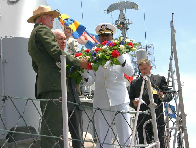 | Keywords: US Navy 050618-N-8110K-056 Boston National Historical Park Supervisor of Interpretation, Bill Foley, Retired Navy pilot and Medal of Honor recipient, Capt. Thomas Hudner, and Commanding Officer, USS Constitution Cmdr. Lewin Wri.jpg en Boston Mass June 18 2005 - Boston National Historical Park Supervisor of Interpretation Bill Foley; Retired Navy pilot and Medal of Honor recipient Capt Thomas Hudner; and Commanding Officer USS Constitution Cmdr Lewin Wright prepare to lay a wreath over the side of USS Cassin Young to honor fallen veterans from all armed services The wreath laying was part of a Department of Defense-sponsored World War II 60th Anniversary Commemoration ceremony at the Charlestown Navy Yard and the culmination to Boston Navy Week Twenty such weeks are planned this year in cities throughout the U S arranged by the Navy Office of Community Outreach NAVCO NAVCO is a new unit tasked with enhancing the Navy's brand image in areas with limited exposure to the Navy U S Navy photo by Journalist 1st Class Dave Kaylor RELEASED 2005-06-18 050618-N-8110K-056 Navy http //www navy mil/view_image asp id 25445 U S Navy photo by Journalist 1st Class Dave Kaylor PD-USGov-Military-Navy Military in Massachusetts Thomas J Hudner Boston Navy Week |