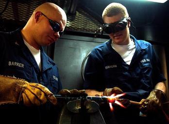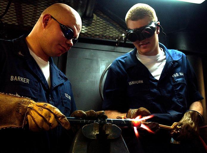 Keywords: US Navy 050710-N-7130B-159 Hull Maintenance Technician 3rd Class Justin Barker, left, and Hull Maintenance Technician Fireman Joe Vanhorn use a torch to heat a length of steel.jpg en Pacific Ocean July 10 2005 - Hull Maintenance Technician 3rd Class Justin Barker left and Hull Maintenance Technician Fireman Joe Vanhorn use a torch to heat a length of steel in the welding booth of the Nimitz-class aircraft carrier USS Ronald Reagan CVN 76 Ronald Reagan is currently underway in the Pacific Ocean conducting Tailored Ships Training Availability TSTA U S Navy photo by Photographer's Mate 3rd Class Aaron Burden RELEASED 2005-07-10 050710-N-7130B-159 Navy http //www navy mil/view_image asp id 26072 U S Navy photo by Photographer's Mate 3rd Class Aaron Burden PD-USGov-Military-Navy Maintenance on USS Ronald Reagan CVN-76 Hull Maintenance Technician United States Navy |