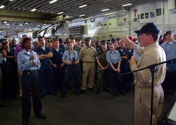 Keywords: US Navy 050712-N-0962S-199 Master Chief Petty Officer of the Navy (MCPON) Terry Scott answers a Sailor's question aboard the amphibious assault ship USS Kearsarge (LHD 3).jpg en Persian Gulf July 12 2005 - Master Chief Petty Officer of the Navy MCPON Terry Scott answers a Sailor's question aboard the amphibious assault ship USS Kearsarge LHD 3 during an all hands call MCPON Scott discussed issues such as advancement exams tuition assistance for education and changes to the physical fitness policy Kearsarge is currently deployed to the Persian Gulf in support of Operation Iraqi Freedom OIF U S Navy photo by Journalist 1st Class Brandan W Schulze RELEASED 2005-07-12 050712-N-0962S-199 Navy http //www navy mil/view_image asp id 26187 U S Navy photo by Journalist 1st Class Brandan W Schulze PD-USGov-Military-Navy Aboard USS Kearsarge LHD-3 Terry D Scott |