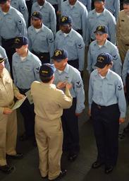 Keywords: US Navy 050712-N-0962S-061 MCPON Terry Scott pins Enlisted Surface Warfare Specialist (ESWS) and Enlisted Aviation Warfare Specialist (EAWS) pins on nearly 50 Sailors.jpg en Persian Gulf July 12 2005 - Master Chief Petty Officer of the Navy MCPON Terry Scott pins Enlisted Surface Warfare Specialist ESWS and Enlisted Aviation Warfare Specialist EAWS pins on nearly 50 Sailors aboard the amphibious assault ship USS Kearsarge LHD 3 prior to an all hands call MCPON talked with Sailors about their changing and evolving missions in the Global War on Terror U S Navy photo by Journalist 1st Class Brandan W Schulze RELEASED 2005-07-12 050712-N-0962S-061 Navy http //www navy mil/view_image asp id 26149 U S Navy photo by Journalist 1st Class Brandan W Schulze PD-USGov-Military-Navy Aboard USS Kearsarge LHD-3 Terry D Scott |