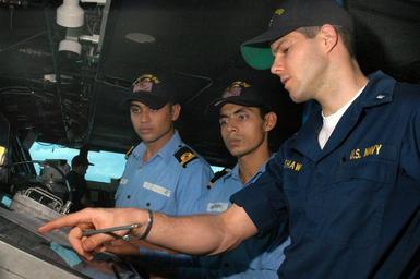 Keywords: US Navy 050715-N-1332Y-006 Junior Officer of the Watch, Lt.j.g. Barry Shaw, right, reviews operating procedures on the bridge aboard the conventionally powered aircraft carrier USS Kitty Hawk (CV 63).jpg en Pacific Ocean July 15 2005 - Junior Officer of the Watch Lt j g Barry Shaw right reviews operating procedures on the bridge aboard the conventionally powered aircraft carrier USS Kitty Hawk CV 63 with Lt Braj Kishore and Lt Pranav Anand Kishore and Anand are Indian Navy Midshipmen participating in a foreign exchange program to promote international relations between United States and countries around the world U S Navy photo by Photographer's Mate Airman Apprentice Adam York RELEASED 2005-07-15 050715-N-1332Y-006 Navy http //www navy mil/view_image asp id 26259 U S Navy photo by Photographer's Mate Airman Apprentice Adam York PD-USGov-Military-Navy Aboard USS Kitty Hawk CV-63 Bridges nautical |