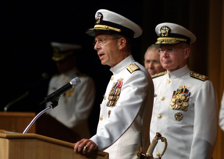 Keywords: US Navy 050722-N-0962S-017 Adm. Mike Mullen reads his orders during the Chief of Naval Operations change of command ceremony.jpg en Annapolis Md July 22 2005 Adm Mike Mullen reads his orders during the Chief of Naval Operations change of command ceremony Mullen relieved Adm Vern Clark as Chief of Naval Operations CNO during a late-morning ceremony at the U S Naval Academy Clark's tenure as CNO began July 21 2000 making it the longest term served by any CNO since Adm Arleigh Burke resigned in 1961 Mullen last served as Commander Joint Forces Command Naples and had operational responsibility for NATO missions in the Balkans Iraq and the Mediterranean U S Navy photo by Journalist 1st Class Brandan W Schulze RELEASED 2005-07-22 050722-N-0962S-017 Navy http //www navy mil/view_image asp id 26469 U S Navy photo by Journalist 1st Class Brandan W Schulze PD-USGov-Military-Navy Vern Clark Michael G Mullen in 2005 2005 Chief of Naval Operations change of command ceremony |