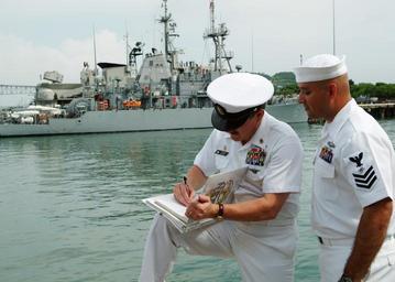 Keywords: US Navy 050805-N-0962S-188 Master Chief Petty Officer of the Navy Terry Scott signs a charge-book for a chief petty officer selectee assigned to USS Devastator (MCM 6).jpg en Panama City Panama Aug 5 2005 - Master Chief Petty Officer of the Navy Terry Scott signs a charge-book for a chief petty officer selectee assigned to USS Devastator MCM 6 MCPON visited a variety of platforms operating in and around Panama to speak with Sailors about PANAMAX 2005 and the importance of joint interoperability with foreign navies PANAMAX is a training exercise in defense of the Panama Canal involving 15 countries U S Navy photo by Journalist 1st Class Brandan W Schulze RELEASED 2005-08-05 050805-N-0962S-188 Navy http //www navy mil/view_image asp id 27230 U S Navy photo by Journalist 1st Class Brandan W Schulze PD-USGov-Military-Navy USS Devastator MCM-6 PANAMAX 2005 Terry D Scott Naval Base Vasco Núñez de Balboa |