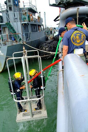 | Keywords: US Navy 050808-N-4772B-044 A pair of Royal Brunei Navy (RBN) divers are lowered from the rescue and salvage ship USS Safeguard (ARS 50) during familiarization dives.jpg en Maura Brunei Darussalam Aug 8 2005 - A pair of Royal Brunei Navy RBN divers are lowered from the rescue and salvage ship USS Safeguard ARS 50 during familiarization dives conducted during the Brunei phase of Cooperation Afloat Readiness and Training CARAT CARAT is an annual series of bilateral military training exercises with several Southeast Asian nations designed to enhance interoperability of the respective sea services U S Navy photo by Journalist 2nd Class Brian P Biller RELEASED 2005-08-08 050808-N-4772B-044 Navy http //www navy mil/view_image asp id 26972 U S Navy photo by Journalist 2nd Class Brian P Biller PD-USGov-Military-Navy Images from US Navy location Muara Brunei |