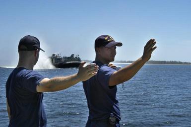 Keywords: US Navy 050907-N-5328N-051 U.S. Coastguardsmen Seaman Doian Allen and Machinery Technician 3rd Class Carlos Riascos direct a U.S. Navy Landing Craft, Air Cushion (LCAC) onto Barrancas Beach on board Naval Air Station Pensacola.jpg en Pensacola Fla Sept 7 2005 U S Coastguardsmen Seaman Doian Allen and Machinery Technician 3rd Class Carlos Riascos both assigned to the Coast Guard cutter USCGC Seahawk WPB 87323 direct a U S Navy Landing Craft Air Cushion LCAC onto Barrancas Beach on board Naval Air Station Pensacola Fla The LCAC is assigned to Assault Craft Unit Four ACU-4 currently embarked aboard the amphibious assault ship USS Bataan LHD 5 as part of the Hurricane Katrina relief effort The Navy s involvement in the Hurricane Katrina humanitarian assistance operations is led by the Federal Emergency Management Agency FEMA in conjunction with the Department of Defense U S Navy photo by Mr Gary Nichols RELEASED 2005-09-07 050907-N-5328N-051 Navy http //www navy mil/view_image asp id 27954 U S Navy photo by Mr Gary Nichols PD-USGov-Military-Navy Landing Craft Air Cushion Naval Air Station Pensacola |