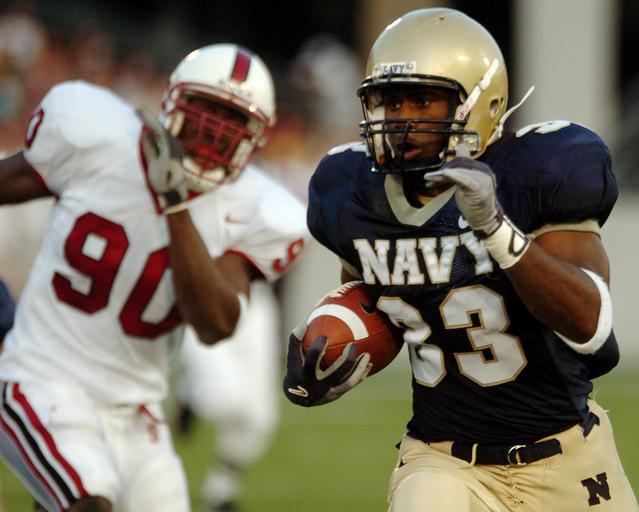 | Keywords: US Navy 050910-N-9693M-005 U.S. Naval Academy Midshipmen slotback Karlos Whittacker outpaces Stanford Cardinal linebacker Udeme Udofia to score in the 2nd quarter.jpg en Annapolis Md Sept 10 2005 - U S Naval Academy Midshipmen slotback Karlos Whittacker outpaces Stanford Cardinal linebacker Udeme Udofia to score in the 2nd quarter Navy 0-2 lost to Stanford 0-1 41-38 U S Navy photo by Damon J Moritz RELEASED 2005-09-10 050910-N-9693M-005 Navy http //www navy mil/view_image asp id 28029 U S Navy photo by Damon J Moritz PD-USGov-Military-Navy Navy Midshipmen football Stanford Cardinal football |