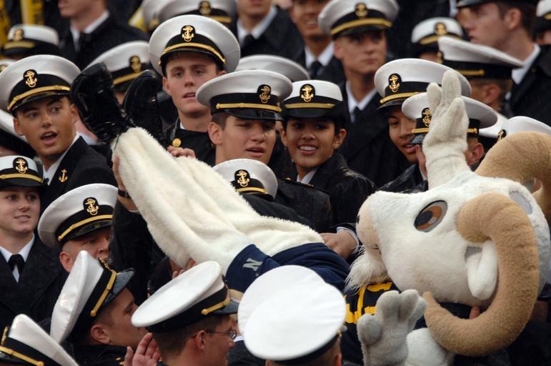 Keywords: US Navy 051008-N-9693M-016 U.S. Naval Academy mascot.jpg en Annapolis Md Oct 8 2005 - U S Naval Academy mascot Bill the goat surfs through the Brigade of Midshipmen during the Air Force-Navy football game A last second field goal gave the the Midshipmen the win over the Falcons 27-24 at Navy-Marine Corps Stadium The victory gives Navy 2-2 a good opportunity to retain the Commander-in-Chief's Trophy awarded to the team with the best record in games between the three major service academies Navy won it in 2003 and 2004 and will retain the trophy unless winless Army beats Air Force and Navy U S Navy photo by Damon J Moritz RELEASED 2005-10-08 051008-N-9693M-016 Navy http //www navy mil/view_image asp id 28772 U S Navy photo by Damon J Moritz PD-USGov-Military-Navy Taken with Nikon D2X U S Naval Academy Midshipmen vs Air Force Falcons Oct 8 2005 Bill the Goat |