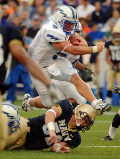 Keywords: US Navy 051008-N-9693M-012 Air Force Quarterback Shaun Carney (5) leaps over U.S. Naval Academy Midshipman line backer Jake Biles for a rushing gain in the second half of play.jpg en Annapolis Md Oct 8 2005 - Air Force Quarterback Shaun Carney 5 leaps over U S Naval Academy Midshipman line backer Jake Biles for a rushing gain in the second half of play A last second field goal gave the Midshipmen the win over the Falcons 27-24 at Navy-Marine Corps Stadium The victory gives Navy 2-2 a good opportunity to retain the Commander-in-Chief's Trophy awarded to the team with the best record in games between the three major service academies Navy won it in 2003 and 2004 and will retain the trophy unless winless Army beats Air Force and Navy U S Navy photo by Damon J Moritz RELEASED 2005-10-08 051008-N-9693M-012 Navy http //www navy mil/view_image asp id 28773 U S Navy photo by Damon J Moritz PD-USGov-Military-Navy U S Naval Academy Midshipmen vs Air Force Falcons Oct 8 2005 |