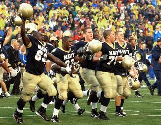 Keywords: US Navy 051008-N-9693M-022 Members of the U.S. Naval Academy football team run across the field toward the home team stands in celebration of their victory over Air Force 27-24 at Navy-Marine Corps stadium.jpg en Annapolis Md Oct 8 2005 - Members of the U S Naval Academy football team run across the field toward the home team stands in celebration of their 27-24 victory over Air Force at Navy-Marine Corps stadium A last second field goal gave the Midshipmen the win over the Falcons and gives Navy 2-2 a good opportunity to retain the Commander-in-Chief's Trophy The highly coveted trophy is awarded to the team with the best record in games between the three major service academies Navy won it in 2003 and 2004 and will retain the trophy unless winless Army beats Air Force and Navy U S Navy photo by Damon J Moritz RELEASED 2005-10-08 051008-N-9693M-022 Navy http //www navy mil/view_image asp id 28774 U S Navy photo by Damon J Moritz PD-USGov-Military-Navy U S Naval Academy Midshipmen vs Air Force Falcons Oct 8 2005 |