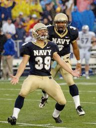 Keywords: US Navy 051008-N-9693M-020 U.S. Naval Academy Midshipmen kicker Joey Bullen celebrates his game winning field goal with 4-10ths of a second left in the game against Air Force.jpg en Annapolis Md Oct 8 2005 - U S Naval Academy Midshipmen kicker Joey Bullen celebrates his game winning field goal with 4/10ths of a second left in the game against Air Force The field goal held by Brian Hampton 3 gave the Midshipmen the win over the Falcons 27-24 at Navy-Marine Corps Stadium The victory gives Navy 2-2 a good opportunity to retain the Commander-in-Chief's Trophy awarded to the team with the best record in games between the three major service academies Navy won it in 2003 and 2004 and will retain the trophy unless winless Army beats Air Force and Navy U S Navy photo by Damon J Moritz RELEASED 2005-10-08 051008-N-9693M-020 Navy http //www navy mil/view_image asp id 28776 U S Navy photo by Damon J Moritz PD-USGov-Military-Navy U S Naval Academy Midshipmen vs Air Force Falcons Oct 8 2005 Navy Midshipmen football players American football placekickers |