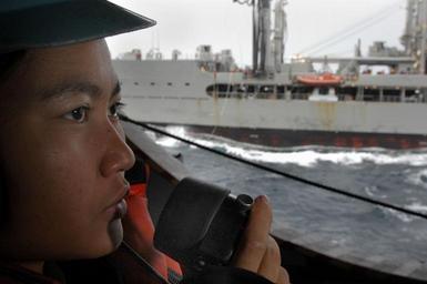 | Keywords: US Navy 051111-N-1332Y-079 Seaman Maria Garcia observes and reports the progress of a replenishment at sea to the bridge.jpg en Pacific Ocean Nov 11 2005 - Seaman Maria Garcia observes and reports the progress of a replenishment at sea to the bridge while standing as a phone talker from the hangar bay aboard the conventionally powered aircraft carrier USS Kitty Hawk CV 63 U S Navy photo by Photographer's Mate Airman Adam York RELEASED 2005-11-11 051111-N-1332Y-079 Navy http //www navy mil/view_image asp id 29864 U S Navy photo by Photographer's Mate Airman Adam York PD-USGov-Military-Navy Underway replenishment Aboard USS Kitty Hawk CV-63 |