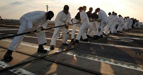 Keywords: US Navy 051114-N-2984R-015 Personnel pull a line across the flight deck of the Nimitz-class aircraft carrier USS Harry S. Truman (CVN 75) during a deperming evolution at the Lambert's Point Deperming Station in Norfolk, Va.jpg en Norfolk Va Nov 14 2005 - Personnel pull a line across the flight deck of the Nimitz-class aircraft carrier USS Harry S Truman CVN 75 during a deperming evolution at the Lambert's Point Deperming Station in Norfolk Va While at the station the ship is wrapped from bow to stern with large electrical cables which are charged with a current that removes the magnetic field from the ship Ships are routinely demagnetized to counter magnetic mines and to stop interference with communication and navigation equipment U S Navy photo by Photographer's Mate Airman Ricardo J Reyes RELEASED 2005-11-14 051114-N-2984R-015 Navy http //www navy mil/view_image asp id 30018 U S Navy photo by Photographer's Mate Airman Ricardo J Reyes PD-USGov-Military-Navy Aboard USS Harry S Truman CVN-75 Lambert's Point Deperming Station |