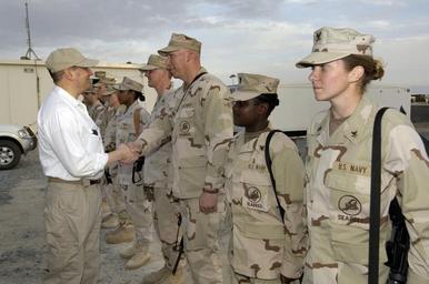 Keywords: US Navy 060127-N-2568S-003 Secretary of the Navy (SECNAV) Dr. Donald C. Winter, meets with Sailors of the Year and Sailors of the Quarter from various units assigned throughout Kuwait.jpg en Ali Al Saleem Air Base Kuwait Jan 27 2006 - Secretary of the Navy SECNAV Dr Donald C Winter meets with Sailors of the Year and Sailors of the Quarter from various units assigned throughout Kuwait Dr Winter is in the Middle East to see first-hand the conditions morale and equipment in use by Navy and Marine Corps personnel deployed to the region U S Navy photo by Chief Journalist Craig P Strawser RELEASED 2006-01-27 060127-N-2568S-003 Navy http //www navy mil/view_image asp id 31552 U S Navy photo by Chief Journalist Craig P Strawser PD-USGov-Military-Navy Ali Al Salem Air Base Donald C Winter |