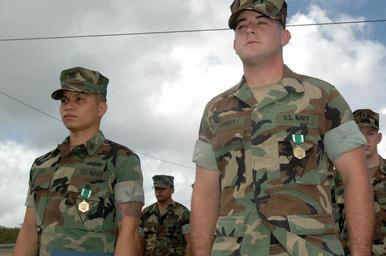 Keywords: US Navy 060317-N-2903K-001 Petty Officer 2nd Class Paul Ryan Judi, left, and Seaman Gregory Chaney stand at attention after receiving the Navy Commendation Medal, for heroic efforts to help save a knife-attack victim's life.jpg en Santa Rita Guam March 17 2006 - Petty Officer 2nd Class Paul Ryan Judi left and Seaman Gregory Chaney stand at attention after receiving the Navy Commendation Medal for heroic efforts to help save a knife-attack victim's life during a routine port visit in Singapore The Judi and Chaney are assigned to Mobile Security Squadron Seven headquartered in Guam U S Navy photo Journalist 2nd Class B L Keller RELEASED 2006-03-17 060317-N-2903K-001 Navy http //www navy mil/view_image asp id 32886 U S Navy photo PD-USGov-Military-Navy Naval Base Guam United States Navy Mobile Security Squadron 7 |