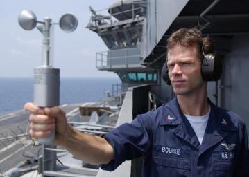 | Keywords: US Navy 060508-N-0933M-001 Aerographer's Mate 3rd Class Arthur Bourke measures wind speed and direction with a handheld anemometer on the island aboard the Nimitz-class aircraft carrier USS Dwight D. Eisenhower (CVN 69).jpg en Atlantic Ocean May 8 2006 - Aerographer's Mate 3rd Class Arthur Bourke measures wind speed and direction with a handheld anemometer on the island aboard the Nimitz-class aircraft carrier USS Dwight D Eisenhower CVN 69 Eisenhower and embarked Carrier Air Wing Seven CVW-7 are currently participating in Composite Training Unit Exercise COMPTUEX U S Navy photo by Photographer's Mate 3rd Class Nathaniel Moger RELEASED 2006-05-08 060508-N-0933M-001 Navy http //www navy mil/view_image asp id 34346 U S Navy photo by Photographer's Mate 3rd Class Nathaniel Moger PD-USGov-Military-Navy Aerographer's Mate Flight deck of USS Dwight D Eisenhower CVN-69 People with safety earmuffs Anemometers |