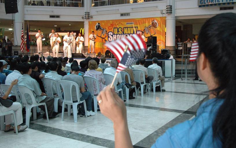 | Keywords: US Navy 060523-N-3532C-270 USNS Mercy Humanitarian Deployment to South East Asia.jpg en Manila Philippines May 23 2006 - An Audience member waves U S flags as the Atlantic Fleet U S Navy Showband performs at Manila's Glorietta Mall The Showband is deployed with Military Sealift Command MSC hospital ship USNS Mercy T-AH 19 and is scheduled to play at various locations during MercyUs five-month humanitarian assistance deployment to South and Southeast Asia and the Pacific Islands The medical crew aboard Mercy will provide general and ophthalmology surgery basic medical evaluation and treatment preventive medicine treatment dental screenings and treatment optometry screenings eyewear distribution public health training and veterinary services as requested by the host nations Mercy is uniquely capable of supporting medical and humanitarian assistance needs and is configured with special medical equipment and a robust multi-specialized medical team who can provide a range of services ashore as well as aboard the ship The medical staff is augmented with an assistance crew many of whom are part of non-governmental organizations which have significant medical capabilities U S Navy photo by Journalist Seaman Joseph Caballero RELEASED 2006-05-23 060523-N-3532C-270 Navy http //www navy mil/view_image asp id 34862 U S Navy photo by Journalist Seaman Joseph Caballero PD-USGov-Military-Navy Images from US Navy location Manila Republic of the Philippines Shopping malls in Manila Aboard USNS Mercy T-AH-19 |