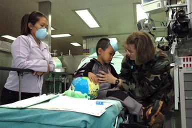 | Keywords: US Navy 060526-N-1577S-073 USNS Mercy Hospital Ship Humanitarian Deployment to Southeast Asia.jpg en Zamboanga Republic of the Philippines May 26 2006 - Air Force Capt Valarie Clegg comforts a patient in the casualty receiving CASREC ward aboard the Military Sealift Command MSC hospital ship USNS Mercy T-AH 19 while anchored off the city of Zamboanga For the next several days the ship will be conducting humanitarian and civic assistance in the local area Mercy is on a five-month deployment to South Asia Southeast Asia and the Pacific Islands Mercy s medical crew will provide general and ophthalmology surgery basic medical evaluation and treatment preventive medicine treatment dental screenings and treatment optometry screenings eyewear distribution public health training and veterinary services as requested by the host nations Mercy is uniquely capable of supporting medical and humanitarian assistance needs and is configured with special medical equipment and a robust multi-specialized medical team that can provide a range of services ashore as well as aboard the ship The medical staff is augmented with an assistance crew many of whom are part of non-governmental organizations that have significant medical capabilities U S Navy photo by Photographer s Mate 3rd Class Timothy F Sosa RELEASED 2006-05-26 060526-N-1577S-073 Navy http //www navy mil/view_image asp id 35071 U S Navy photo by Photographer s Mate 3rd Class Timothy F Sosa PD-USGov-Military-Navy United States Navy in Zamboanga City Aboard USNS Mercy T-AH-19 |