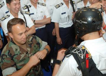 Keywords: US Navy 060530-N-9662L-080 Petty Officer 1st Class Tony Andrews, a Navy parachutist assigned to Naval Special Warfare Unit One (NSWU-1), explains the functions of a MT1X free fall parachute.jpg en Santa Rita Guam May 30 2005 - Petty Officer 1st Class Tony Andrews a Navy parachutist assigned to Naval Special Warfare Unit One NSWU-1 explains the functions of a MT1X free fall parachute and it's components to officers and cadets from the Republic of Korea Air Force ROKAF Academy during a static display at the NSWU-1 compound Maj Gen Bu Jung Bae Vice Superintendent ROKAF Academy and his staff toured military instillations on Guam and historical sites in the region U S Navy photo by Photographer's Mate 2nd Class John F Looney RELEASED 2005-05-30 060530-N-9662L-080 Navy http //www navy mil/view_image asp id 35445 U S Navy photo by Photographer's Mate 2nd Class John F Looney PD-USGov-Military-Navy Naval Base Guam Republic of Korea Air Force Naval Special Warfare Unit One |