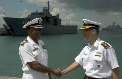 | Keywords: US Navy 060530-N-9851B-007 Commander, Destroyer Squadron One, Capt. Al Collins, shake hands with Col. Joseph Leong, commander of the Republic of Singapore Navy^rsquo,s first flotilla.jpg en Singapore May 30 2006 - Commander Destroyer Squadron One Capt Al Collins shake hands with Col Joseph Leong commander of the Republic of Singapore Navy s first flotilla outside the Changi Navy Base auditorium following the opening ceremony for the Singapore phase of exercise Cooperation Afloat Readiness and Training CARAT 2006 CARAT is an annual series of bilateral maritime training exercises between the United States and six Southeast Asia nations designed to build relationships and enhance the operational readiness of the participating forces U S Navy photo by Photographer s 2nd Class John L Beeman RELEASED 2006-05-30 060530-N-9851B-007 Navy http //www navy mil/view_image asp id 35266 U S Navy photo by Photographer s 2nd Class John L Beeman PD-USGov-Military-Navy Naval ships of the United States in Singapore Cooperation Afloat Readiness and Training 2006 Changi Naval Base |