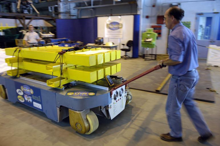 | Keywords: US Navy 060601-N-7676W-054 John Jansen from the Oak Ridge National Laboratory (ORNL) demonstrates the Office of Naval Research (ONR) sponsored Compact Agile Material Mover (CAMM) to Navy leaders from the CVN-21 Aircraft Carrier.jpg en Oak Ridge Tenn June 1 2006 - John Jansen from the Oak Ridge National Laboratory ORNL demonstrates the Office of Naval Research ONR sponsored Compact Agile Material Mover CAMM to Navy leaders from the CVN-21 Aircraft Carriers Naval Air Forces and other Naval Sea Systems Commands The CAMM along with Human Amplification Technology HAT effort enables one person to move very heavy cargo items up to 10 000 pounds with nearly pinpoint accuracy The key technology is the Off-Center In-Line Omni-directional Wheel OCILOW and its associated electrically powered drive train capable of moving heavy payloads in confined spaces on uneven surfaces and in varying shipboard sea-induced motions U S Navy Photo by Mr John F Williams RELEASED 2006-06-01 060601-N-7676W-054 Navy http //www navy mil/view_image asp id 35348 U S Navy Photo by Mr John F Williams PD-USGov-Military-Navy Images from US Navy location Oak Ridge Tenn |